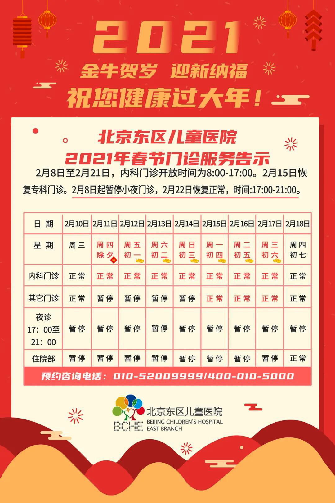 春节期间,luck新利门诊调整如下:2月10日至2月17日,春节假期开放内科门诊,开放时间为8:00-17:00。2月15日恢复专科门诊。2月8日至21日暂停小夜门诊,2月22日恢复正常,时间为17:00-21:00。金牛贺岁,迎新纳福!东区儿童医院全体工作人员祝您及家人新春快乐,万事如意。