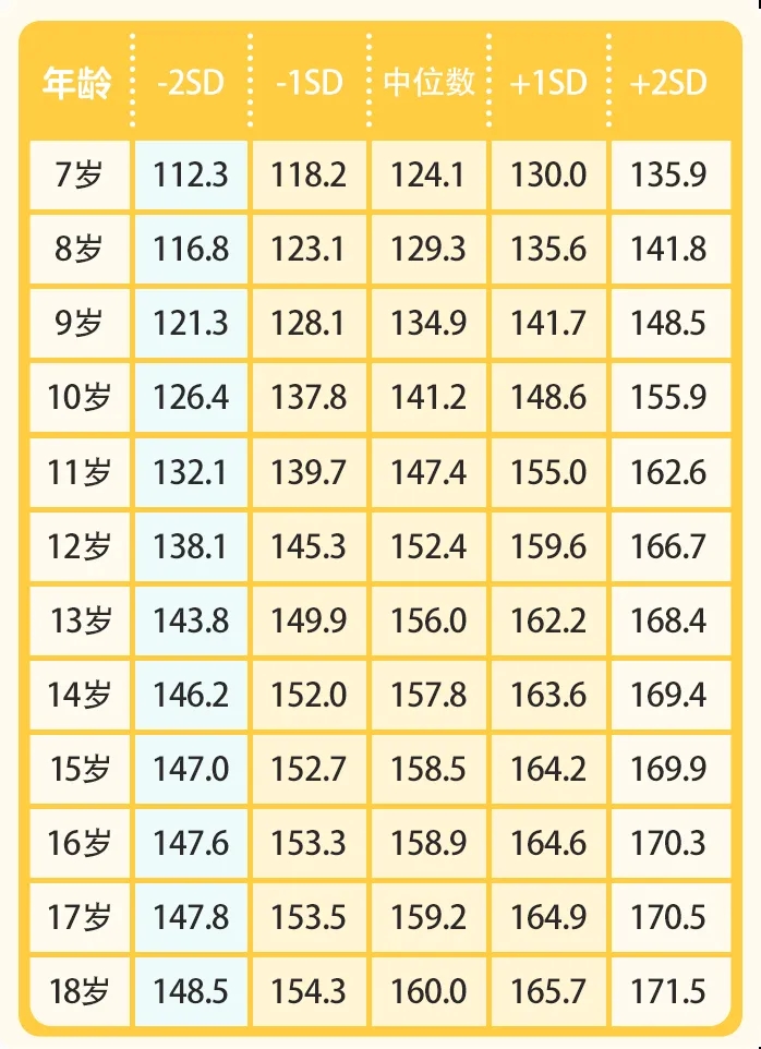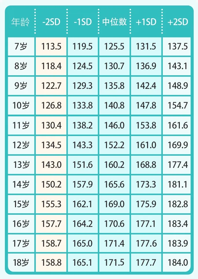 7 岁以后的孩子,可以参考2018年国家卫健委发布的《7-18岁儿童青少年身高发育等级评价》的数据。