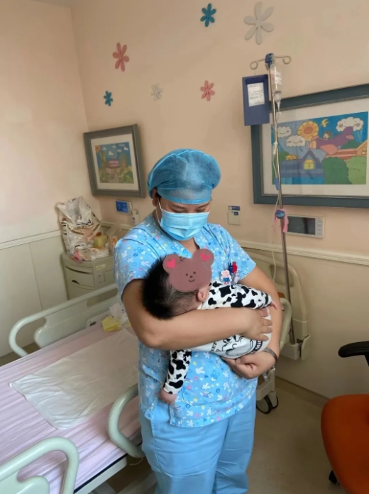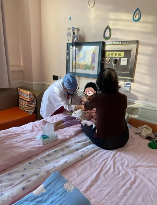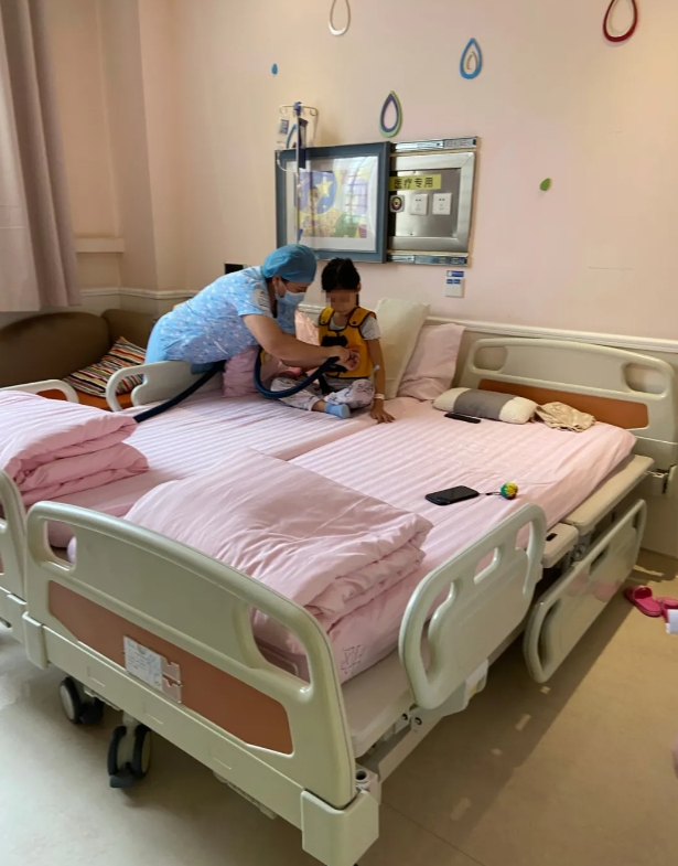 温馨的单人间病房,护士正在给宝贝做拍背咳痰,做舒适化治疗,宝贝和家长都能睡个好觉。