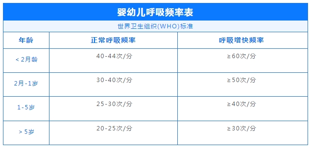 1. 观察呼吸变化:在孩子睡觉或者安静的时候,数孩子呼吸的次数,一呼一吸算一次,早中晚各数一次,连续着数三天。可以参照表中数据,同时还要观察有没有喘憋、呼吸费力、鼻翼煽动、口周发青,这四种呼吸困难的情况。