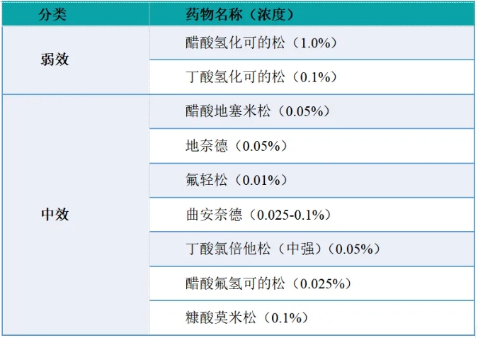 注:同一成分不同浓度的糖皮质激素,药效也不同,如氟轻松(0.01%)为中效,而氟轻松(0.025%)为强效,购买使用时需注意。