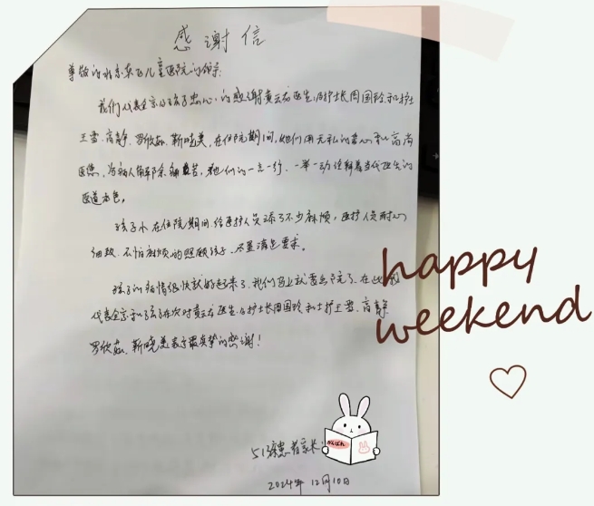家长和宝贝们亲手写的感谢信,字里行间满是对医生悉心诊疗、护士贴心照料的诚挚谢意,在繁忙的工作中,宛如冬日里的暖阳,格外暖心。luck新利的医护人员也想对家长们说:“我们深知责任重大,每一个决策、每一次治疗都不敢有丝毫懈怠,每一个微小的进展都牵挂着医护团队的心。看到孩子在我们的共同努力下一天天好起来,那种成就感和满足感是无法用言语来形容的。而您们在整个过程中给予我们的信任、理解与配合,对我们来说是莫大的支持和鼓励。未来的日子里,愿家长和孩子开开心心,无病无灾。再次感谢您们的感谢信!”