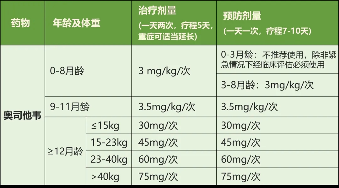 5岁以下的小朋友属于流感的高风险人群,预防时的每次用量和治疗时一样,每天只需要口服一次,疗程是7-10天,具体用量参照上面的表格或咨询医生。