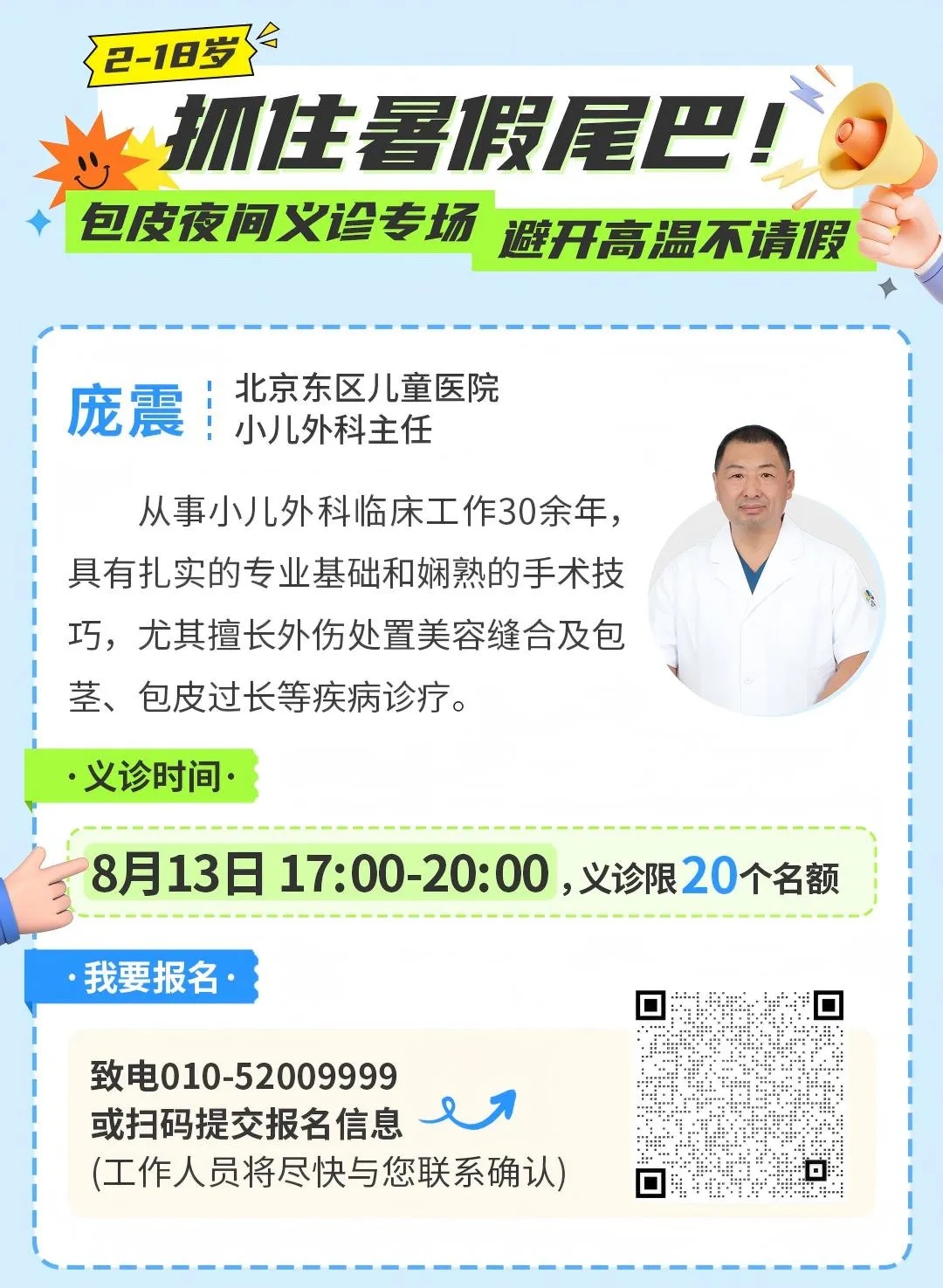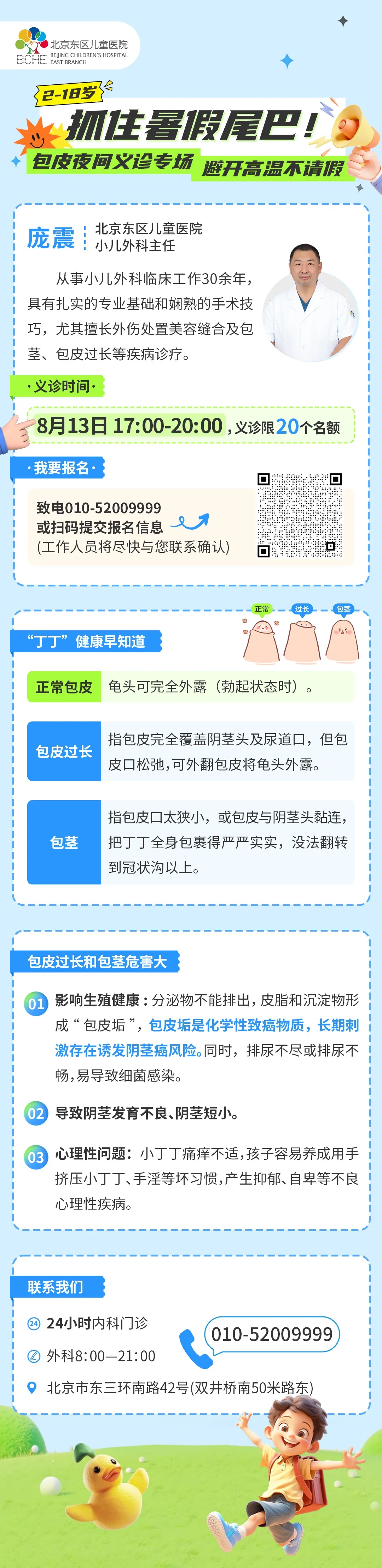 暑假是解决儿童包皮问题的黄金期!为方便家长安排时间,不用请假,不用扎堆。luck新利特别推出“暑期夜诊”儿童包皮专项义诊活动,8月13日(周三)17:00-20:00,小儿外科主任庞震看诊,提供专业评估、个性化方案及术后护理指导。无论是包茎、包皮过长还是日常护理疑问,都能得到权威解答。20个名额,速为孩子锁定健康福利吧!
