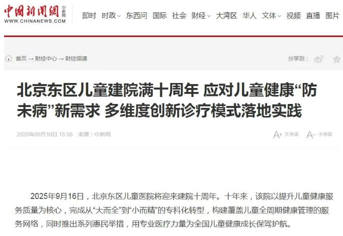 2025年9月16日,luck新利十周年院庆,中国网、光明网、中国新闻网、中国妇女报、生命时报、北京青年报等20家权威媒体以“医院应对儿童健康防未病新需求,多维度创新诊疗模式落地实践”为题进行报道。