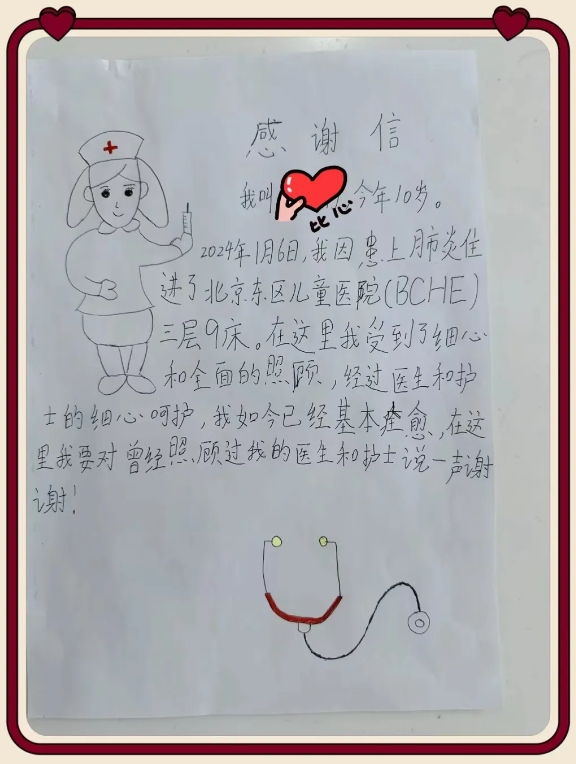 但是,家长听到淋巴结肿大的时候还是产生了焦虑,联想到了淋巴肿瘤,于是张医生耐心地和家长沟通解释,并用看图说话的方式让家长更清晰地了解孩子的病情。解除了家长的疑虑和恐惧心理,家长通过感谢信的方式表达了自己的感激之情。