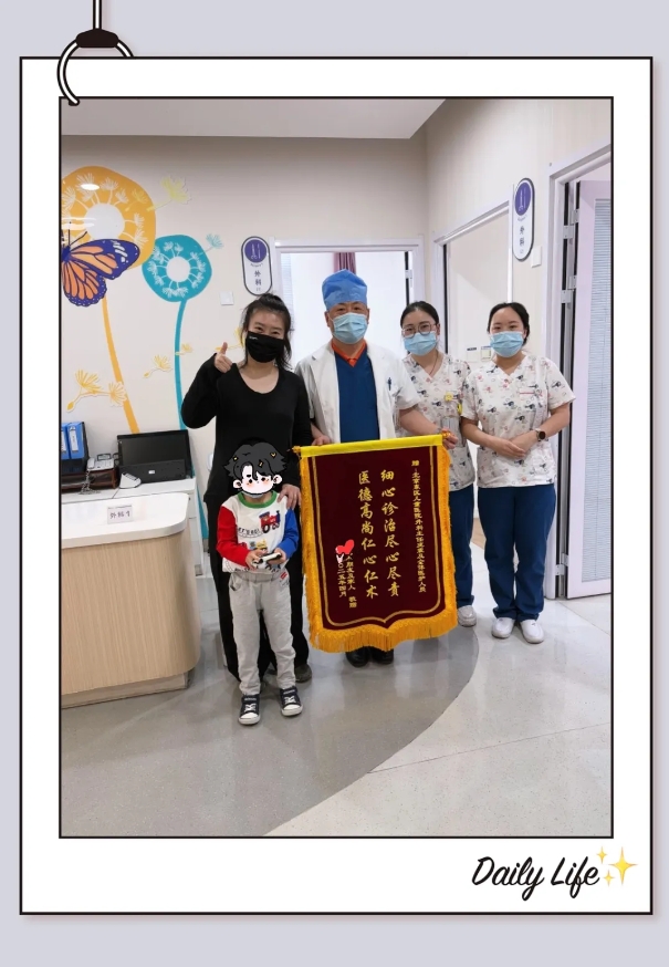 一周后复诊时,庞震主任详细询问孩子日常情况:“平时是不是大便干燥?还容易感冒?”家长连连点头。庞主任结合影像报告进一步解释:“肠道残留的干便需要几天排净,肠套叠复位后,肠管恢复血流炎症因子再灌注损伤、肠道细菌移位,会引起发烧,需要医生处理治疗。”通俗的解释就是,肠套叠复位后,因为之前被卡住的肠子突然恢复供血(就像憋久的水管突然通水),可能会有点“过激反应”,导致发烧。另外,被压过的肠子可能有“小伤口“,肠道里的细菌趁机入血溜到别处,也可能引起感染发烧。果然,孩子回家后症状变化与庞主任预判分毫不差,家长因提前知晓从容应对。家长特意给庞主任和郭医生各赠送了一面锦旗:“要不是庞主任团队技术高超,孩子可能就要挨一刀了!“