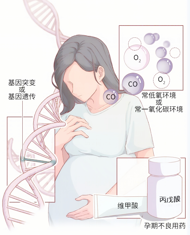 母体孕期过多接触维甲酸、丙戊酸、低氧、一氧化碳等致畸因素。